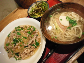 お昼ごはんは、いつものお店のランチセット。 肉あんかけ炒飯、首里そば(半)、サラダ、お新香。