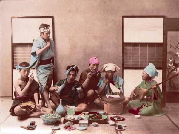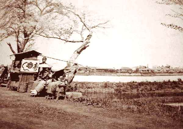 (写真1)江戸末期の酒盛りと書いてあったが、頭が違うな、明治の初めかな。 確かに細いなみんな…。 (写真2)江戸時代の屋台の寿司屋。 これじゃ、塩や酢でしめないとダメだよね~^^。 ---------------------------------------------------------------------------