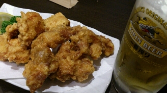 ビールに唐揚げ。テッパンメニューだわね~。 んで、元気な飲みっぷり、食いっぷり。 それでこそ、きのっちゃんだわ!