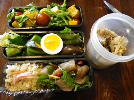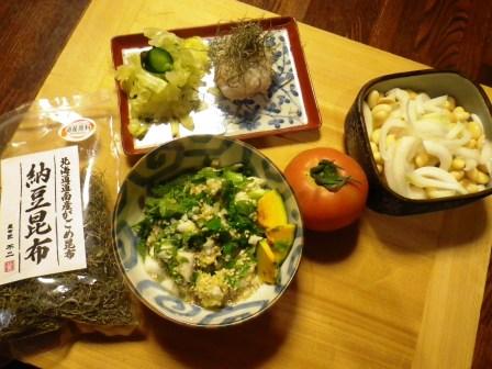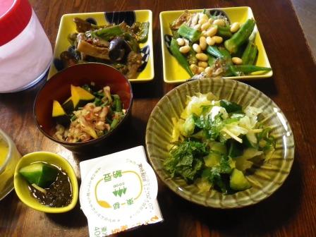 ○おにぎり50g&浅漬 ・冷汁(豆腐100g・鶏ひき・とろろ・南瓜・薬味) ・トマト1個 ・豆玉さらだ1/2