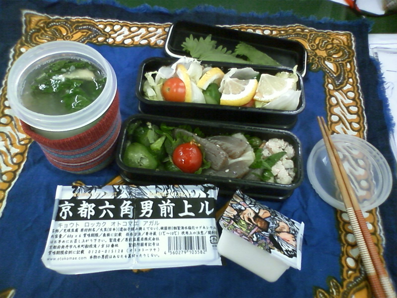 【昼・弁当】 ★写真② ≒ …勤め先に賞味期限切れの豆腐60g×3個…飯無しで片付けました…た、足りん(>_<)