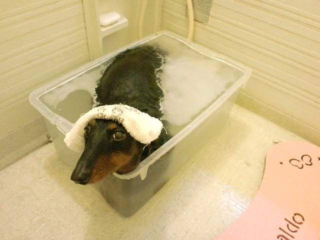 RON君気持ちよさそう。 我が家の犬は、チッチャイ頃からお風呂だけは嫌いで、 逃げまくって大変でした。湯船につかっているなんて?? 頭にタオル乗せていよいよオッサンですか~~? 失礼!