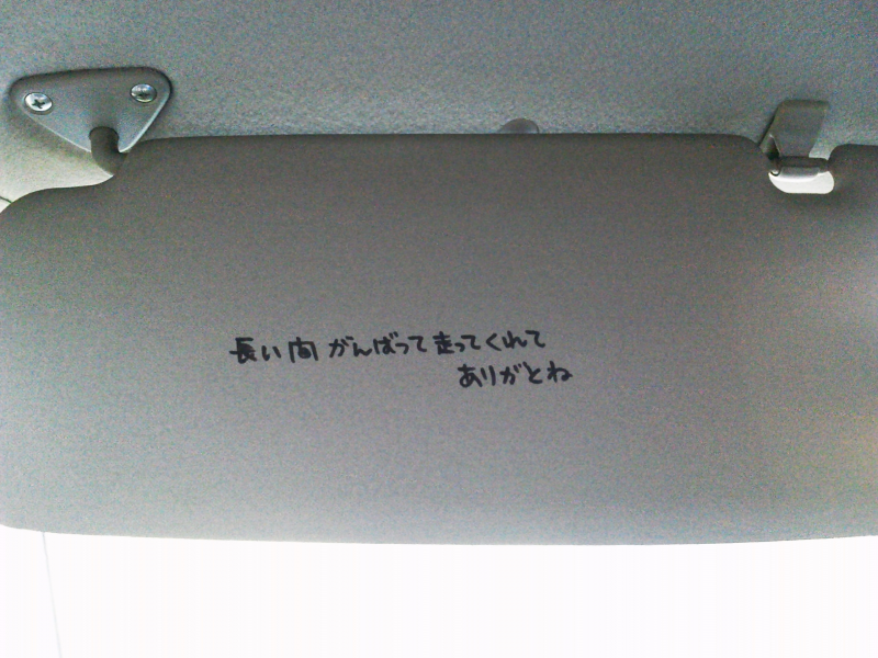 車の中で歌ったり、ケンカしたり、笑ったり、泣いたり いろんなことを黙って見ててくれた車だもん。^^ 最後はあっけないお別れだけど どうしても気持ちを伝えたくてねー、落書きしちゃったのよん。