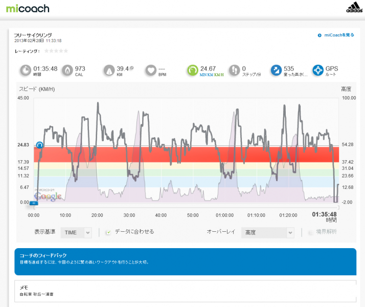 adidas miCoachが設定しているゾーンらしいです。 グラフで高度、速度、時間が分かります。 ゾーンの種類は レッド(3:27-2:30分/キロ) イエロー(4:07-3:27分/キロ) グリーン(5:18-4:07分/キロ) ブルーノ(9:16-5:18分/キロ)の4種類 その設定したゾーンで開始するとゾーンに合わせてリアルタイムに音声でコーチングをしてくれます。 1キロあたりのペース、カロリー、時間が分かります。 フリーのアプリですがなかなか良いです。