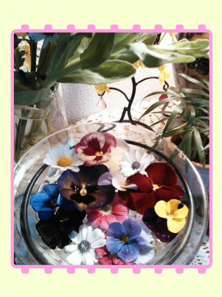 あ・・100均で「フラワーベース」買ったよ♪ ☆我が家のお庭に咲くお花を、浮かべてみました・・☆ 黄色いお花は「オンシジウム(ダンシング・レディ・オーキッド)」 黄色いドレス着た貴婦人が、踊っているみたい・・?