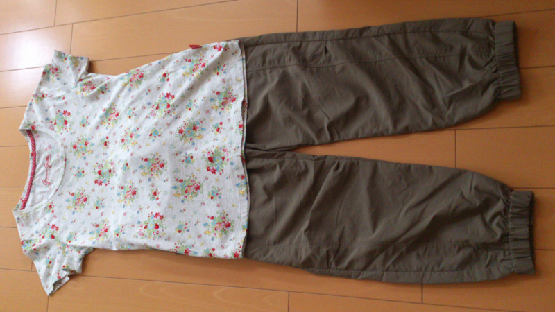 春っぽい花柄のTシャツとシャカシャカパンツ。 早速着せてみると、サイズも良い感じ。
