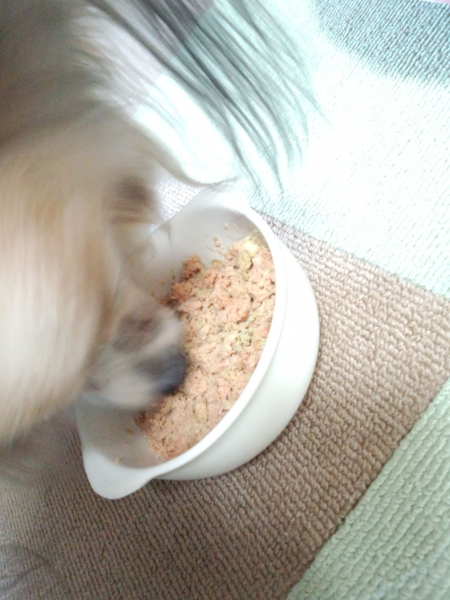 いざ、フードを出すとちょっと臭いをかいでそっぽを 向いてしまいます。