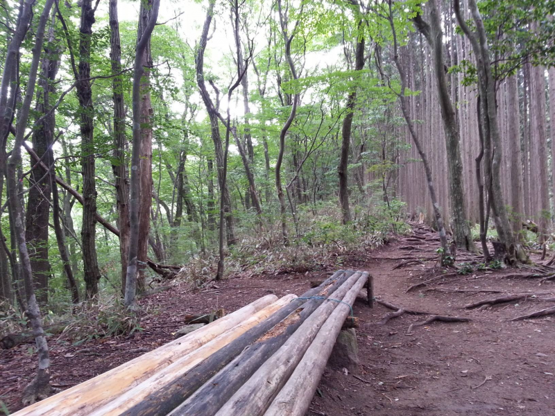 尾根の道は右手に杉林、左に原生林を眺めながらの景色でした。