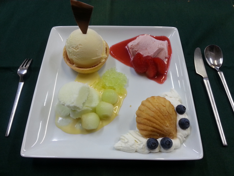 作り方はソースやクリームを先に用意して、最後 お客さまに出す寸前にアイスクリームとジェラートを盛り付けます。ミントは庭にいっぱい栽培していますが、この季節からしばらく葉がなくなるのです。スーパーに行けば売っているけど、それでは原価が上がってしまいます