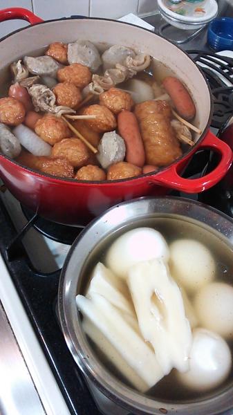 いろんな即材入れると美味しいよね。 わが家は、サザエの串さしとか、黒はんぺんとかを入れますよ。 作ると三日間ぐら食べ続けます、たくさんつくたほうが確かに美味しい。