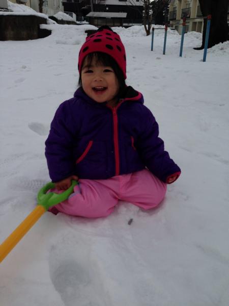 お孫ちゃん、笑顔いっぱいで、可愛いですね。。 雪が、明るく、あったかく感じます。。