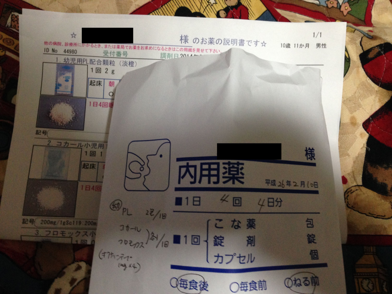 昼過ぎに、帰宅したら、チビが早退して寝てました。 熱が38℃あるようで、もしかしたらインフルかもということで病院に連れていきましたが、一先ず陰性ということで、色々風邪用(熱)の薬もらってきました。 なんか、元気ないです(あたりまえか・・・)