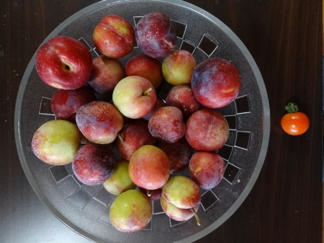 今年初めて、プラムの収穫、第一弾。 大豊作の去年に比べて、小さくて少ないけど、嬉しい収穫。 無農薬なので、虫食いだらけの分は、いいところだけでジャムでも作らねば。 今年初めてのミニトマト(1つだけ!)も収穫。