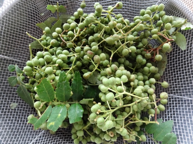 主人が午前中、山椒の実を収穫。 この山椒の実、普段は元気がないとき、胃の調子が悪いとき、気付け薬代わりに一粒なめると元気が出るんだけど、主人が昔、心筋梗塞になって救急車が来るまでの間にこれを舌の下に入れたら、心臓の痛みが3分の1以下に減って、苦しまずに病院に行けたという、とても有難い食物。 ニトログリセリン効果を発してくれた、命の薬。あとで調べたら狭心症の治療にも役立つそうな。