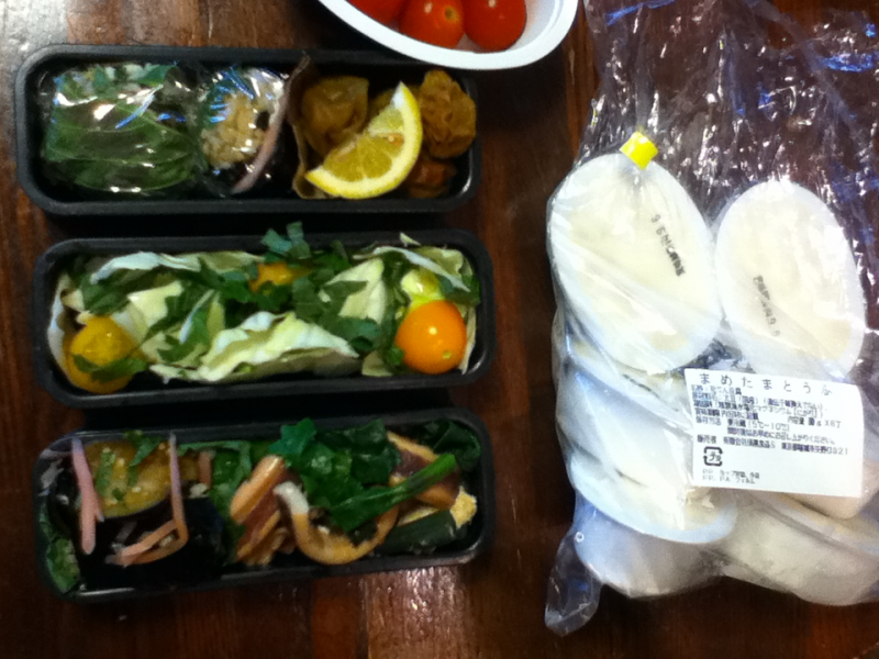 【12:30】 豆腐 下) 茄子漬&プチおにぎり・煮物(烏賊&豆腐 中) カッテージチーズ&野菜 上) 粕汁・梅ジュースの梅(おやつ用おにぎりは後~)