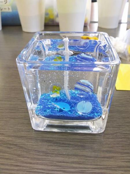それから次はウェスティンホテルでおいしいビュッフェスタイルのお食事をいただき幸せな気持ちでした。 それから酒造会社に見学に行きお酒の試飲をしました。私は飲めなかったけど・・・ たこせんべいの里で買い物をしてパルシェ香りの館でジェルキャンドル作り。 私はイルカを乗せて海をイメージしましたがイルカが深海魚になっちゃいましたー