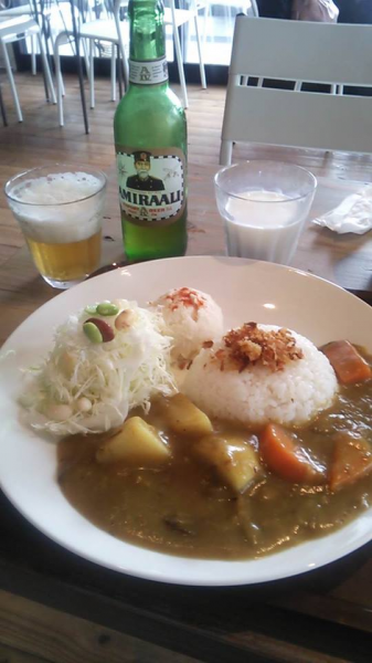 ドブ板通りもちょっと散歩。イベントをやっていたらしく、横須賀バーガーや横須賀海軍カレーもお店は行列。 たまたま空いているカフェがあり、カレーもあったのでランチしました。 牛乳付のカレーライス。ビールもプラス。ビールは6種類くらいあったかな、すべてが横須賀のビール。 東郷平八郎ビールをチョイス。(写真2)