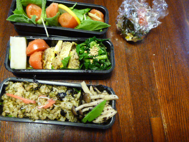 【朝ごはん】 *370 玄米・味噌汁110 豆腐・納豆110 もずく・かすぴ&果物60 ゆかり和・焼浸40 卯の花オムレツ&おろし50
