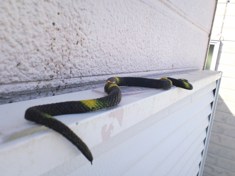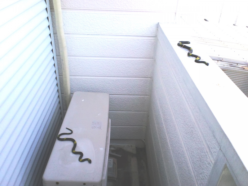 使ってない2階の和室の雨戸をあけたら たらーっとヘビが あっ! そうか この前貼り付けたヘビでした~(笑) 雨戸のレール部分に以前からの糞がいっぱい 手が届かないのでブロワーで吹いたらOKでした。
