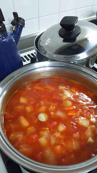 冷蔵庫の野菜の片付けに、朝からミネストローネスープ作り♪ ペンネを入れるとカロリー上がっちゃうからな~、、、どぅしよっかな。