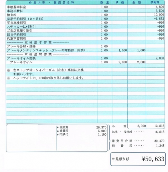 車検終了 見積り通りでいろいろお土産頂いて帰宅 毎回気持ちのいい対応と価格で大満足。