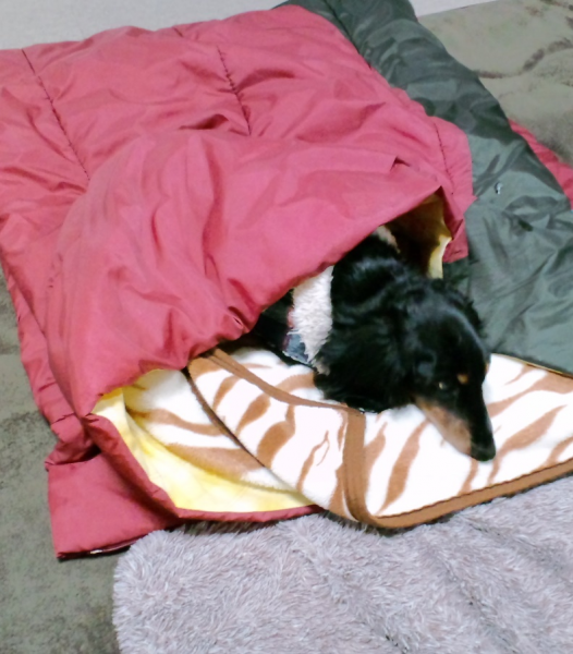 はい 凄く不気味な夜でした 何事も無くて良かったです。 リビングで寝袋に入って仮眠していると RONも入って来てくれて あったかいですわ(笑)