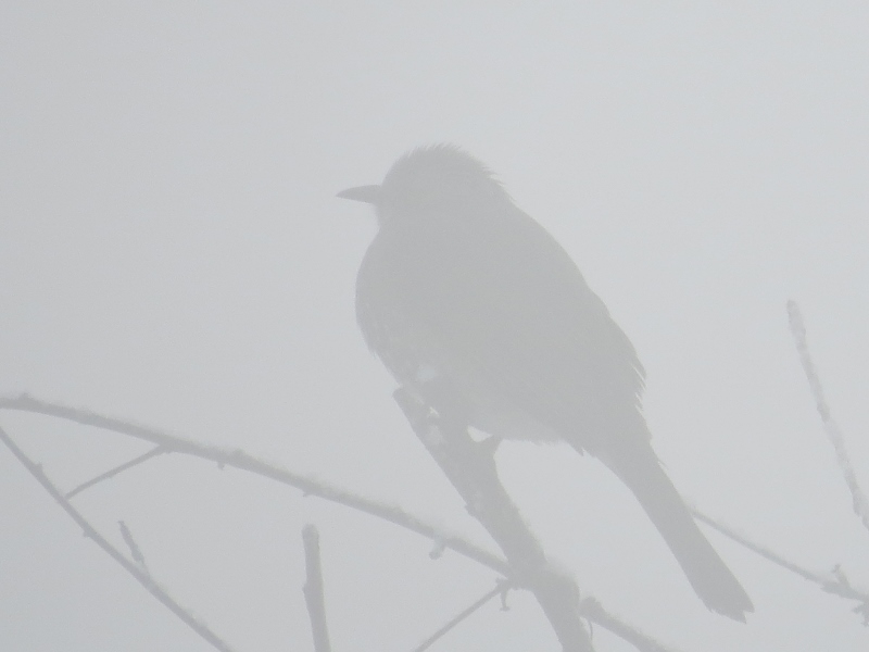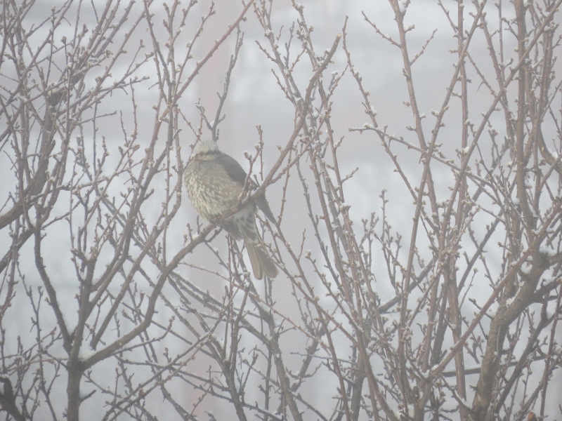 写真はウチの庭に来た濃霧の中の小鳥たち(スズメとヒヨドリ)。