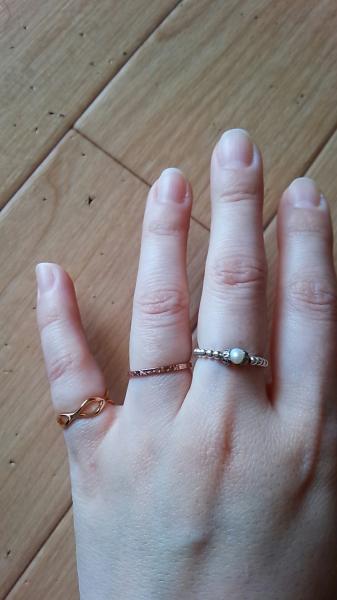 雑貨屋さんで300円のリングを購入。 ゴールドとピンクゴールドとシルバーの色合いを確かめたくて。 結婚してたときは結婚指輪しかしなかったけど 最近、ピンキーリングが気になって。 でもやっぱりはめると薬指が一番指輪が綺麗に見えるんだよね。 色合いはピンクゴールドがいいかな。