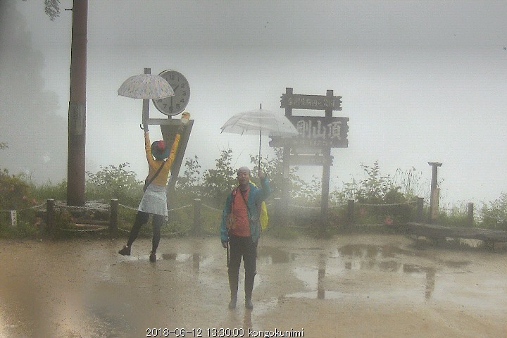 山頂に着いても雨は止むどころか、ますます激しくなってきた。気温13℃、じっとしていると寒い。食堂に入りたかったが、ざるそばと鉄火巻きを持ってきたので中で注文するものがない。山頂の屋根つきベンチはグループが使っているので、錬成会雨宿り場へ行く。ご夫婦と男性のハイカーが食事を取っていて、皆天気が午後から回復するつもりで来たとおっしゃっていた。