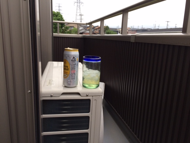 ベランダで飲み始めたですが、狭くて、又テーブルがないからエアコン屋外機を使うが、写真2 何とも情緒がない、わが家でやるには、庭の方がいいかなぁ、大阪のケーキ屋さんとの真似は無理ですね。