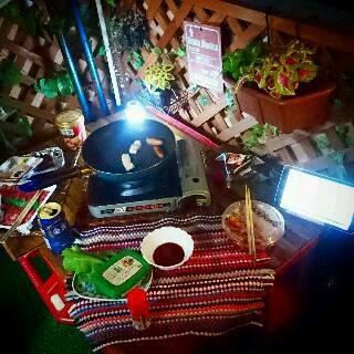 よっしゃぁ‼ スーパーで焼き肉用パック買ってひとり焼き肉しよう。そうだ、どうせならベランダでやってみよう。 と、隊長が店閉める時にもらったカセットコンロを置いてフライパンで肉を焼いた。今日はミノもあるぞ。 照明は百均のが3つ。蚊取り線香ふたつ。当然小さな虫は来るけど、電球についているだけなので大丈夫。蚊に刺されることもなかった。 焼いた肉を自家製サンチュで巻いて食べる。ビールで流す。後半は芋焼酎グレープフルーツジュース割り。 BGMはタブレットでボブ・ジェームス&アール・クルーのCool を近所迷惑にならないようボリューム小さめに。