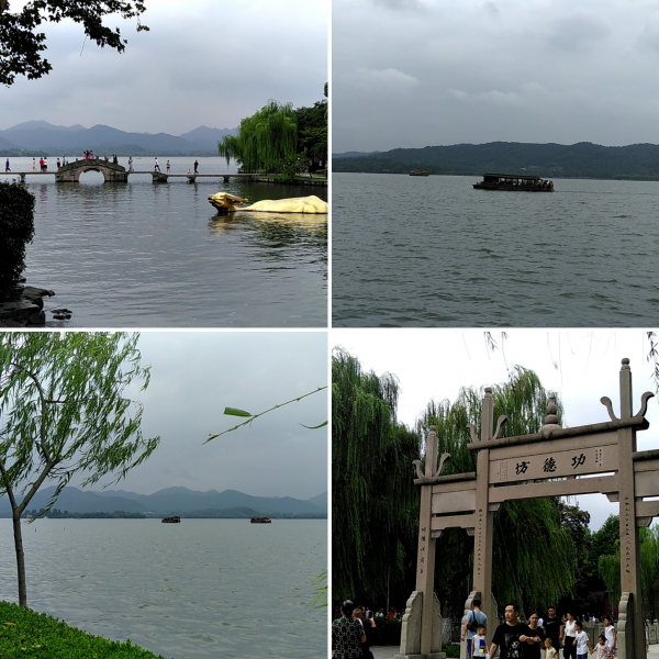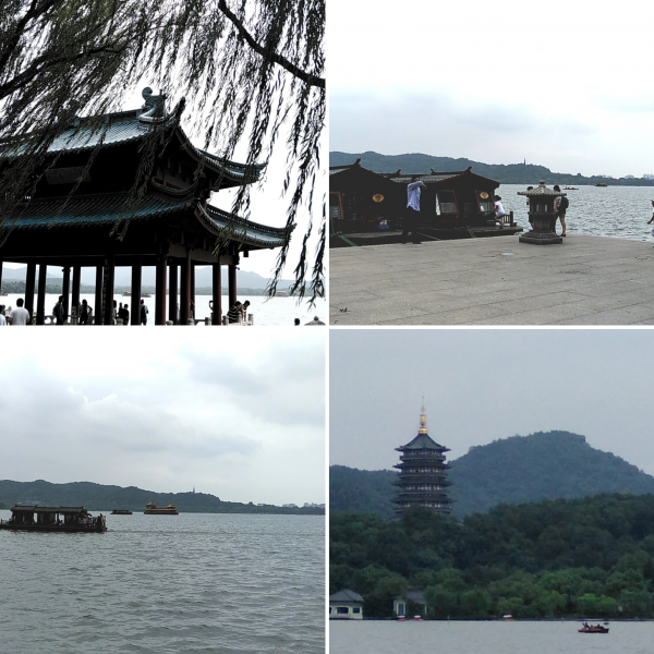 街路樹はわざと枝分かれさせていると思いますよ。大きく見せるためか日陰を多くするためか不明。 西湖の大きさ:南北3.3km、東西2.8km、外周15kmだから歩くのには良い距離ですね! 湖岸にはおなじみの柳と南宋時代?に模した東屋があって風情は有ります。屋形船にも乗りたくなると言うもの。 ただ世界遺産だけあって人が多いのが玉に瑕かな(ー。ー)フゥ