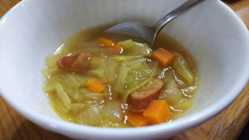 コンソメ味の野菜スープ、カレーパウダーを入れてピリ辛に。
