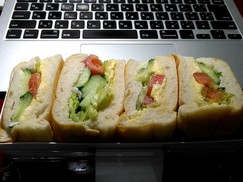 昨夜の晩御飯、これに缶ビール2本。 このサンドイッチは210円くらい、缶ビールはASAHIでしたが1本60円くらいだから安上がり!