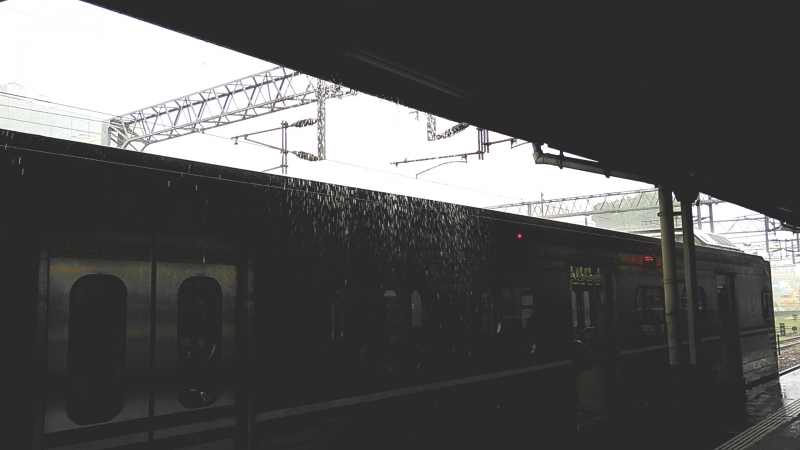 今朝もアパートから出たらいきなりバケツを引っくり返したような豪雨! 三越の軒下で暫く雨宿りしていたものの電車の時間も有るのでドボドボになりながら駅まで。 ホームに停車中の電車も余りの大雨にドアを締めていたがよく有ることなんだろう。