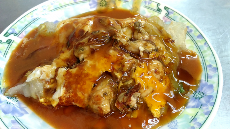 お昼は飲食店通りの老舗オアチェンを食べに。 牡蠣のオムレツです。小ぶりの牡蠣が入って甘いタレがかかっています。 一皿60元!(*'ー'*)ふふっ♪