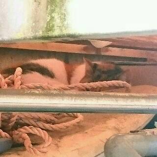 この夏にうちのケヤキの木に登ったまま降りられなくなったネコ。 相変わらずうちの周りが縄張りなようだが、最近裏手(お隣との境界)の棚代わりにしているウインドサーフボードの上に昼寝しに来る。ちょうど車用の今は使っていない座布団の上で休んでいるようだ。 このネコ、木から降ろしてもらったのを覚えているのだろうか、わたしが側に寄っても逃げようとしない。もしこのネコがメスで子供でも産んだらかなわないので、昔なら追い払っているところだが、他のネコのように悪いことはしないし、それに妙に愛着が湧いてきたので、しばらく黙認することにした。 どうも居心地が良いみたいだ。