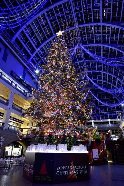 画像は広尾町から切り出されたもみの木(全長15メートル)に飾り付けられた『サッポロファクトリーのイルミネーションツリー』 広尾町では毎年新しい巨木を寄贈しています。