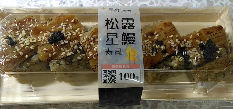 ふと見ると鰻の文字が見えた。 量的にはこれくらいで丁度よいから衝動買してしまった。 松露とあるのはトリュフのこと。たぶん2枚めの写真の上に乗っている黒いゴマみたいなやつかと思う。 調べると星鰻はどうも穴子のことらしい。 100元(360円)特に何の感動もなし・・・