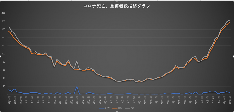 日々全国で感染者数の増加具合についてマスコミ、テレビなどで報道されていますが、ここまで感染が広がってしまっては正直な所、あまり感染者数のみを報道するのは意味が無いように感じてしまいます。 当然感染者数が多いという事はそれだけ危険なリスクが増大するという指標に他ならないので全く意味が無い訳ではないのでしょうが、それならば日々の重傷者数や死亡者の数を 性格に把握している数を公表して逼迫している状況がどの程度なのか分かりやすいようにした方が良いのではと思います。 報道によると高齢者や他の病気にかかっていて免疫力が低下している人が感染した場合には重篤な状況になる可能性が高いのでそういう方はより注意が必要でしょうが、 日本全国で感染者が広がった状況ではもはや感染者を抑えるというのは無理というか再び非常事態宣言を出して国民の生活、経済活動を凍結する以外に手段はないと思います。 それが出来るのならば、感染者数を把握する意味はあるのかもしれませんが、恐らく国はもう非常事態宣言は出さないでしょう。 余程の危機的状況が起きない限りは 全国の重傷者、死亡者数に加えて各自治体の医療機関の許容数を並行して公表する事で国民により危機意識を高める事が急がれるのではないでしょうか。 NHKで公表している数値を元に私なりにグラフを作成してみましたが、恐らくどこかのサイトで同じデータ(グラフ)を公開している場所があると思うのでご存じの方は紹介いただけますでしょうか。(エクセルでいちいちデータを入力する手間が省けると助かるので)