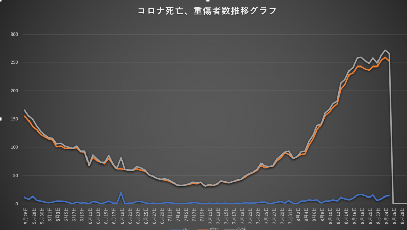 武漢ウイルスの報告が日々流れていますが、死亡者、重傷者数の推移をみると増加傾向から若干小康状態になりつつあるようにも見えますが、 まだまだ予断を許さない状況に感じます。 ちょっと気になるのが、死亡者数が少しずつジワジワと増加傾向にあり、恐らく高齢者の方が感染して被害を受けているのではと予想されます。 いい加減にコロナ疲れが蓄積してきて気が抜けそうになりますが、ここで手を抜くとあっという間に状況が一変してしまう恐れがありますので まずは快食快眠快便で健康を維持し、免疫力を保つ事と、特にお年寄りと接する時には十分に注意しての接触が寛容かと