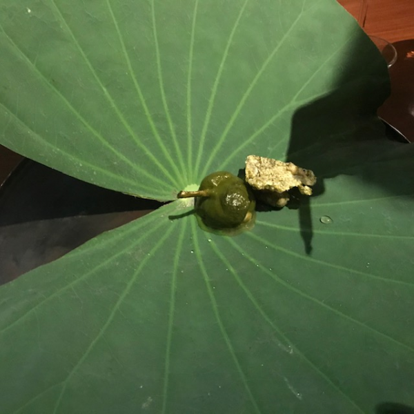 様々な、懐石風のモダン・タイ料理が出てくる中で、 バナナの葉っぱ(だと思う)をシート代わりにした一品が出てくる。