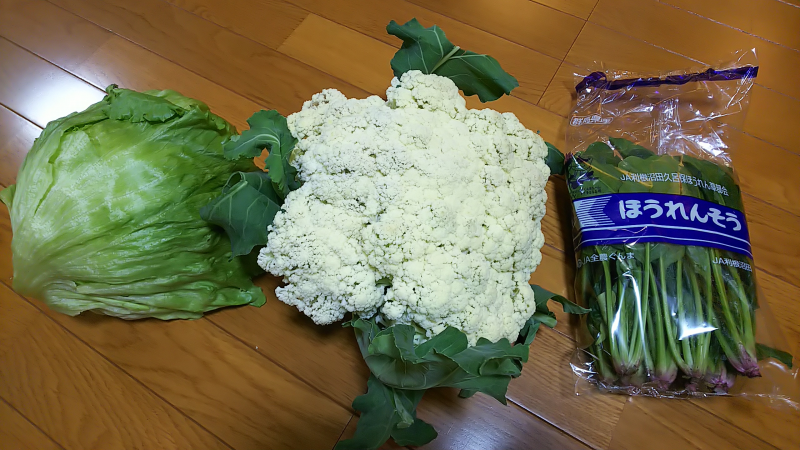 ご近所さんに野菜いただいた! レタスにほうれん草、そして、どでかいカリフラワー w(゜o゜)w カリフラワー、好物だから嬉しい~(^∇^) 買ったら高いもんね(笑)