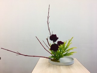 7月以来だから、4ヶ月ぶりのいけばな教室。 今日のはこれまた、花屋の店先で、自分では絶対に選ばない花材。 サンゴ水木 サンゴの赤 カーネーション ボルドーという赤 セッカン杉 で、面白かった。