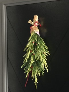 持ち帰った花材の残りで、 昨年習ったリースの作り方を思い出しながら、 リースじゃないけれど、 とりあえず取って置いたリボンやフラワーペーパーで、 ソレっぽいモノを作ってみた。 ナマのセッカン杉が青々とイイ感じ。