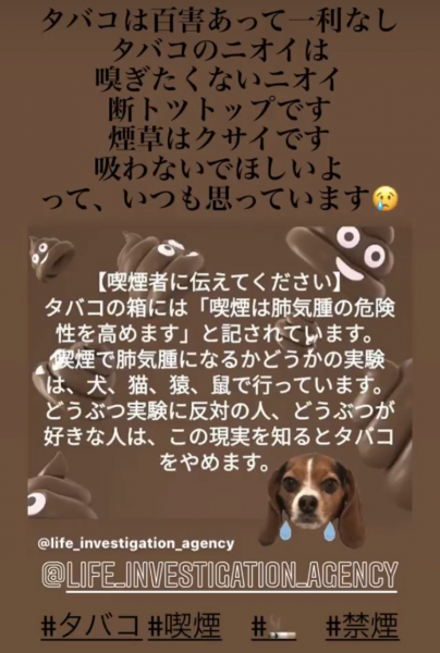まず、煙草の害について動物実験を行う理由が分かりません。煙草が「殺す」ものである事など、人間の自主的な実験(喫煙による死亡)によって明らかではないですか。