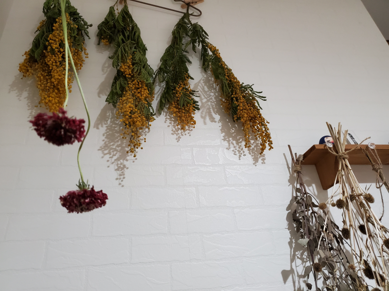 ミモザはあっという間にドライフラワーになったので 他のものと組み合わせてまた花束みたいにしますよー