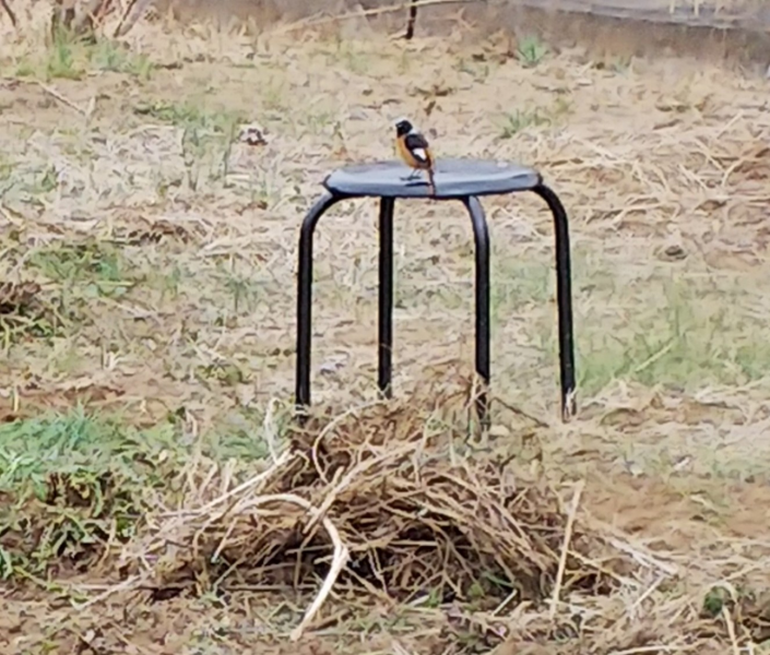 今回はジョウビタキがすぐ近くにずっといて、ちょこちょこ地面に降りてきて虫を探してた。 写真は休憩用に出しておいたイスでさえずるジョウビタキくん。 スマホ古いので写真ボケボケf(^^;)