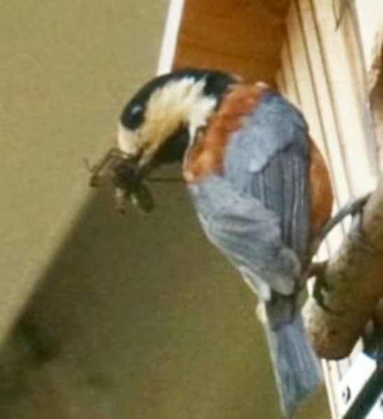 今朝も早い時間からヤマガラ夫婦の給餌活動。 これまでは青虫を口いっぱいにくわえていたが、今日はクモ。柔らかいエサから昆虫も食べ始めたようだ。ひとで言うと離乳食。巣箱から元気そうなヒナ達の声が聞こえる。