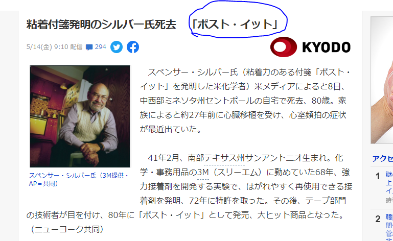 私の前職(とは言っても社名が同じというだけですが)での大先輩の訃報が流れていました。 私はお会いしたこともなく、発明者のエピソードは良く聞いていたので一度会えるものならば会ってみたいものだなあくらいにしか思っていなかったのですが。 今では事務職のみならず家庭でも非常に便利かつ手軽に使っている付箋紙(製品名の方が伝わりやすいのですが)で社名も相当有名になり、売り上げにも相当貢献している逸品です。 もしも私が生きている間にアメリカに行く機会があれば、是非氏のお墓に出向いて線香をあげてきたいと思います。(米国では線香の風習は無いかと思いますが) どうか安らかに